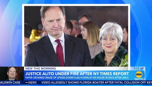 After not-so cleverly trying and failing to get Justice Clarence Thomas to recuse himself from important Supreme Court cases related to January 6, the left and the media have moved on to try to not-so cleverly get Justice Samuel Alito to recuse himself based on a photo of an upside-down flag outside his home that was said to show support for the rioters. On Saturday’s Good Morning America…