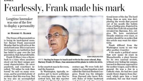 The Washington Post responded to yesterday's retirement announcement by Rep. Barney Frank (D-Mass.) today with not one but two well-placed positive stories. "Longtime lawmaker brokered critical deals as skilled negotiator," gushed the subheader to Paul Kane's 20-paragraph page A1 article.