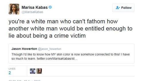 Marisa Kabas, a reporter for Univision-owned website Fusion, devoted a series of Twitter posts on Thursday to forwarding the wild theory that Olympic swimmer Ryan Lochte displayed his "white privilege" in his dubious claim that he was robbed at gunpoint while in Rio. Kabas targeted Jason Howerton of The Blaze, after he Tweeted, "Seriously, how did you did make Lochte **allegedly** being a jerk…