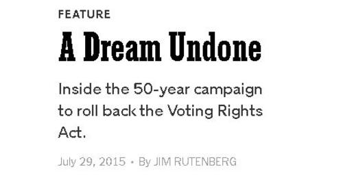 The New York Times Magazine cover story by political correspondent Jim Rutenberg, "A Dream Undone -- Inside the 50-year campaign to roll back the Voting Rights Act," is a 10-part, 10,000-word doorstop (issued with the baleful threat "The first in a series") comparing current attempts to stop voter fraud as a return to Jim Crow, with particular focus on North Carolina. Rutenberg also relayed more…