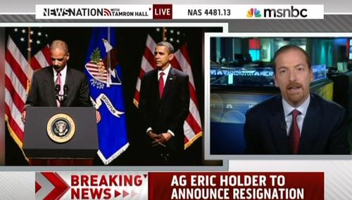 Appearing on MSNBC's News Nation on Thursday to react to Attorney General Eric Holder announcing his resignation, NBC's Meet the Press moderator Chuck Todd had the audacity to proclaim that Holder "wasn't political at all" during his tenure at the Justice Department. [Listen to the audio]