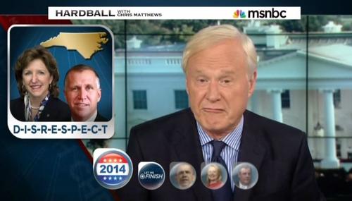 MSNBC may be gearing up for another election season of war on women. The Hardball host on Friday speculated whether the Republican senatorial candidate from North Carolina engaged in sexism by aggressively attacking his Democratic opponent. Before showing clips of Thom Tillis sparring with Senator Kay Hagan, Matthews sneered, "But sometimes, the more we watch, the more we avert our eyes."
