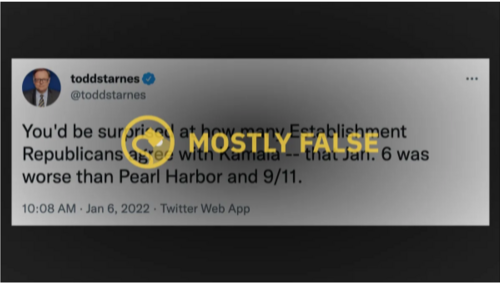 Vice President Kamala Harris began her speech marking the one-year anniversary of the January 6 riot by comparing it to Pearl Harbor and 9/11. I joked the "independent fact-checkers are taking the day off." They didn't. Snopes declared conservative radio host Todd Starnes "Mostly False," not Kamala Harris.