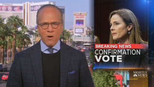 Shortly before the Monday Senate voted to confirm then-Judge Amy Coney Barrett to the Supreme Court in a 52-48 vote, NBC Nightly News anchor Lester Holt whined about Republicans getting the nomination through without any votes from Democrats. And on ABC’s World News Tonight, anchor David Muir gaslit his viewers with a lie about how fast Barrett’s confirmation was.