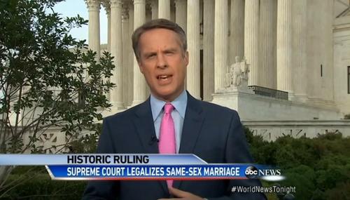 On Friday, ABC's World News Tonight aired a completely one-sided report on the Supreme Court's ruling that legalized same-sex "marriage" in all 50 states. Terry Moran hyped how Justice Anthony Kennedy "wrote today's landmark opinion describing the stakes in this case in the loftiest terms." Moran failed to include any soundbites from social conservative opponents of the decision, and hyped how "…