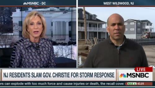 On MSNBC on Tuesday, New Jersey Democratic Senator Cory Booker admonished host Andrea Mitchell for trying to use the weekend blizzard to attack Republican Governor Chris Christie. After Mitchell wondered if Christie had “risked” his presidential campaign “by his response to flooding from the winter storms back home,” Booker pushed back: “Literally some families on this – in this community lost…