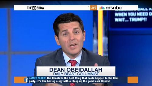 Appearing as a panel member on Sunday's AM Joy on MSNBC, liberal comedian and Daily Beast columnist Dean Obeidallah injected lame comedy into the show's final segment as he cracked that, in the week ahead, Donald Trump might pick David Duke as a Supreme Court justice or someone who "hates the environment" for EPA administrator.