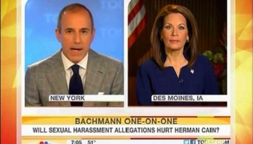 In an interview with Michele Bachmann on Friday's NBC Today, co-host Matt Lauer's first four questions pushed Bachmann to comment on the Herman Cain controversy: "As the only woman in this race, I just would like your perspective on all this....Do you think you are hearing the truth, the whole truth, and nothing but the truth from Herman Cain?"