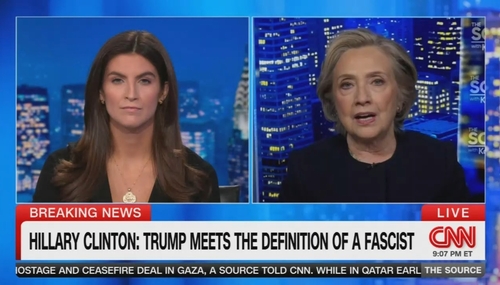 Hillary Clinton appeared on the Kaitlan Collins show on CNN to elaborate on the theme that Donald Trump is a fascist. She implied Trump's upcoming rally at Madison Square Garden will resemble the Nazis rallying there in 1939. She's a bitter clinger.