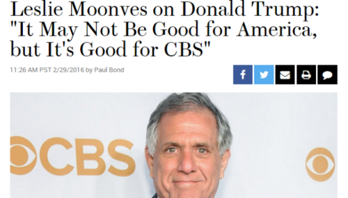 That's how network executive chairman and reliable Democratic donor Les Moonves described Donald Trump's frontrunner status in the GOP primary, noted the Hollywood Reporter today.