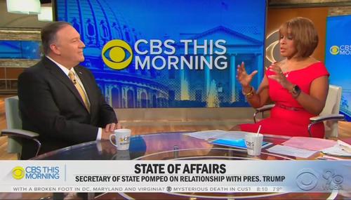 CBS This Morning co-host Gayle King on Tuesday repeated a nasty quote about Mike Pompeo, deriding the Secretary of State as a “heat-seeking missile for Trump’s” ass. King interviewed Pompeo for Tuesday’s show and parroted the vulgar comment from a New Yorker piece. She regurgitated, “One former American ambassador who shall not be named, this is delicate, describes you like ‘a heat-seeking…