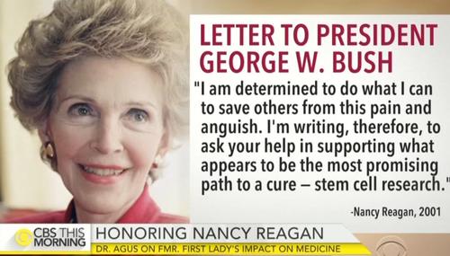 While remembering the legacy of Nancy Reagan on Monday, all three network morning shows made sure to highlight an issue in which she broke with much of the Republican Party – embryonic stem cell research. On NBC’s Today, Peter Alexander touted: “With Alzheimer's Disease robbing her husband's memory, Mrs. Reagan was again cast into a supporting role, with a new cause, a champion of stem cell…