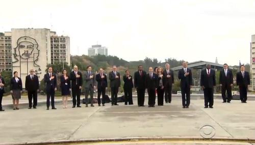 On Monday night amidst the voluminous amount of Cuba coverage, ABC’s World News Tonight and NBC Nightly News made sure to not inform their viewers of an ominous and disturbing backdrop hours earlier when President Obama and a portion of the U.S. delegation stood in Havana’s Revolution Square with a mural of the brutal leftist leader Che Cuevara in the background.