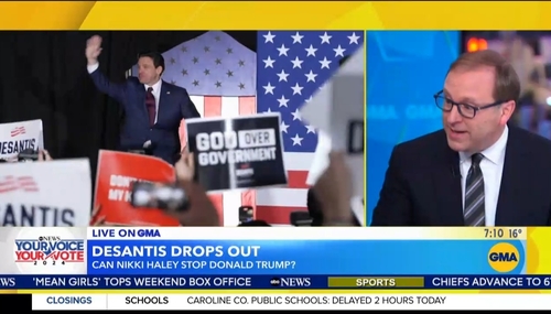 Unsurprisingly, Disney-owned ABC News was ebullient on Monday’s Good Morning America with the news from Sunday afternoon that Governor Ron DeSantis (R-FL) – who took on and embarrassed the Sunshine State behemoth — had dropped out of the 2024 presidential race, calling it an “implosion” and “spectacular failure” that hadn’t been seen in American history.