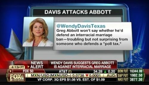 Wendy Davis keeps failing. The one-time media darling keeps whiffing in her attacks against her Republican opponent in the Texas gubernatorial race. On Monday she implied Texas Republican Attorney General Gregory Abbot was against interracial marriage - even though Abbot’s wife, Cecilia, is a Latina.