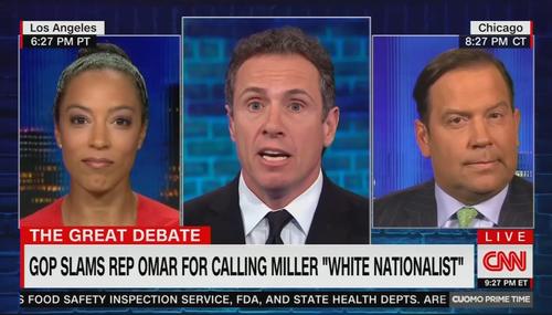 The “great debate” on Tuesday’s edition of Cuomo Prime Time focused on Rep. Ilhan Omar’s tweet condemning White House adviser Stephen Miller as a white nationalist. The conversation quickly deflected into a debate about the meaning of the word nationalism, with host Chris Cuomo describing it as a “loaded term” and accusing Miller of having an “apparent affinity” for white supremacists.