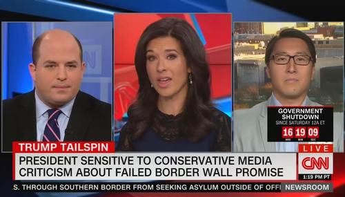 On Saturday's CNN Newsroom, host Ana Cabrera was joined by CNN's Brian Stelter to bemoan the fact that President Donald Trump reacted to criticism from conservatives by holding firm on border wall funding and rejecting a plan to delay a shutdown of the government. Stelter complained the conservative media's "entertainment wing, that's the Sean Hannitys of the world....have an enormous amount…