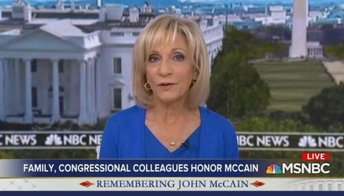 On Friday afternoon, during one of the rare liberal media acknowledgements of Louis Farrakhan's prominent presence at Aretha Franklin's funeral, MSNBC host Andrea Mitchell gave an odd underreaction as she cited it as evidence of an "inclusive group" being on stage.