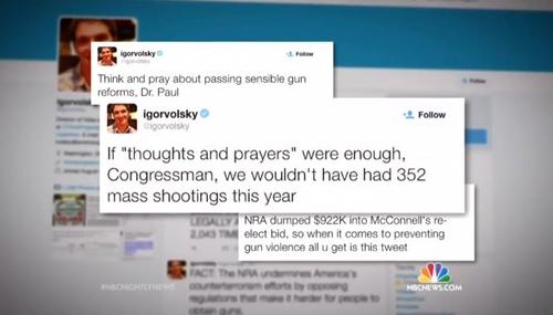 Following the liberal media’s strategy of attacking God-fearing people for offering their “thoughts and prayers” concerning the San Bernardino shooting, Thursday’s NBC Nightly News joined that chorus with a unrelenting report from NBC News correspondent and MSNBC host Andrea Mitchell that also lamented the lack of Democratic gun control proposals. She touted: "Liberal blogger Igor Volsky set off…