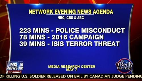 During a segment on the Thursday edition of the Fox News Channel’s The O’Reilly Factor, host Bill O’Reilly cited a new analysis from the Media Research Center that detailed the massive amount of coverage the “big three” of ABC, CBS, and NBC devoted in the month of April to numerous “allegations of police misconduct” compared to the time spent reporting on the terror group ISIS.