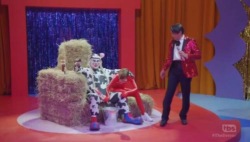 If you thought TBS’s strange comedy The Detour couldn’t possibly top their disturbing sexualization of a young girl last season, you might be unpleasantly surprised to find out they came pretty close in Tuesday’s episode, “The Game Show.” This time, the scene involves a teen boy simulating masturbation of an adult man dressed in a cow costume while also begging his mother to roll over 12 supine…