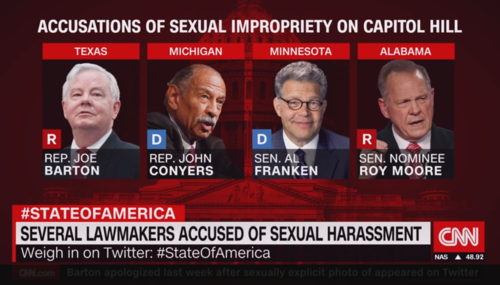 Near the end of Wednesday’s State of America on CNN International, the show published a head-scratching graphic that placed Republican Congressman Joe Barton (Tex.) alongside other political figures who, unlike Barton, have been accused of sexual misconduct. To make matters worse, CNN political commentator Angela Rye ripped into “white, liberal women” for supposedly forcing House Minority Leader…