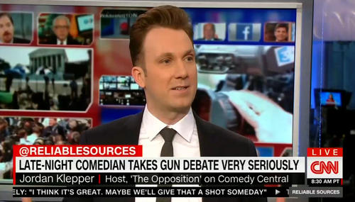 Doubling as a weekly liberal media pep talk, CNN’s Reliable Sources host Brian Stelter featured ludicrous spin from liberal Comedy Central host Jordan Klepper on gun control, complaining that the gun control viewpoint has been insufficiently covered in the media, and the NRA falsely has created a “narrative” that their opponents want to take people’s guns away.