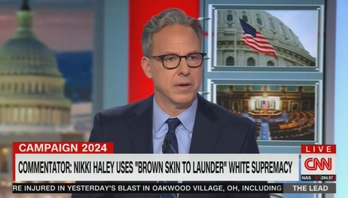 The good Jake Tapper made an appearance Tuesday in the second hour of CNN’s The Lead as he did a segment with his panel calling out New York Times opinion writer and MSNBC guest Wajahat Ali for his racist and sexist smear Sunday of 2024 GOP presidential candidate Nikki Haley as “us[ing] her brown skin to launder white supremacist talking points.” At one point, Tapper said it…