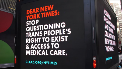 If you need a table-pounding laugh, check out the radical-left activists who have accused The New York Times of horrible right-wing bias. GLAAD – which is best described as the Gay and Lesbian Alliance Against Debate – sent a truck around Times Square claiming The Times “prioritizes anti-LGBTQ voices over the voices of transgender people and medical experts.”