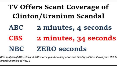 Beginning on October 17, The Hill broke new stories on the Clinton/Russia/Uranium scandal that deserved extensive coverage. And while Fox News Channel has thoroughly covered the breaking developments they’ve been, unfortunately, the exception and not the rule in TV news. From October 17 through November 2 The Big Three (ABC, CBS, NBC) networks have devoted a piddly 4 minutes and 38 seconds to the…