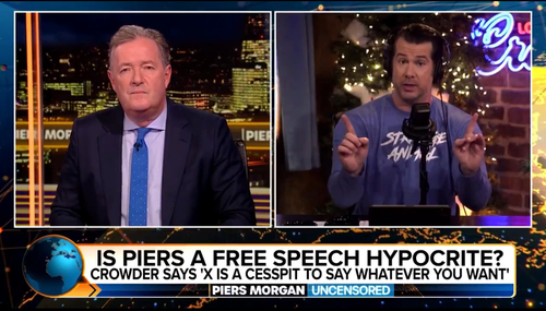 Show host Steven Crowder went on Piers Morgan’s show and ripped Big Tech censorship, listing national crises caused or worsened by suppression of free speech online.